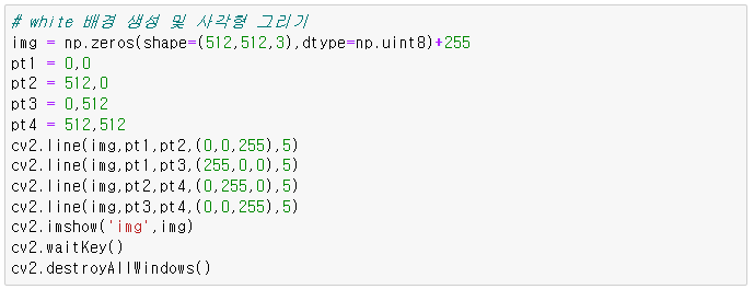 - 윈도우 파괴: cv2.destroyWindow(winname) cv2.destroyAllWindows()
