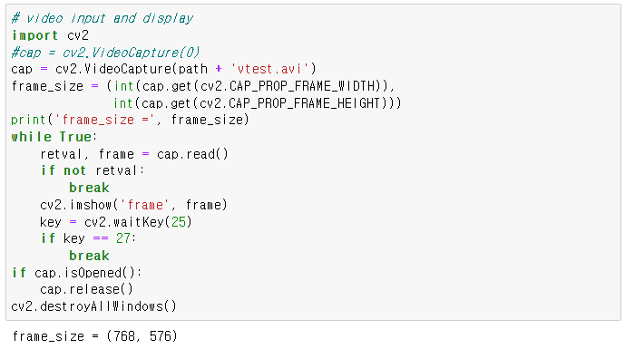 - 비디오 획득 객체 생성: cv2.VideoCapture() → cv2.VideoCapture(filename) → cv2.VideoCapture(device) → device = 0, 1, …