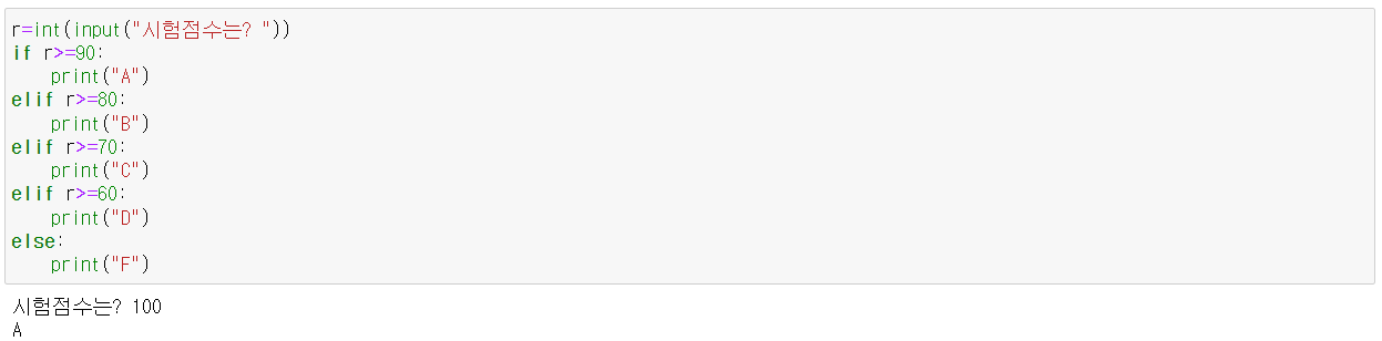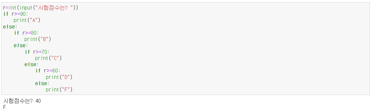 - 시험 점수가 90점 이상이면 A, 80점 이상이면 B, 70점 이상이면 C, 60점이상이면 D, 60점 미만이면 F를 출력하는 프로그램을 작성하세요.