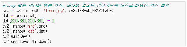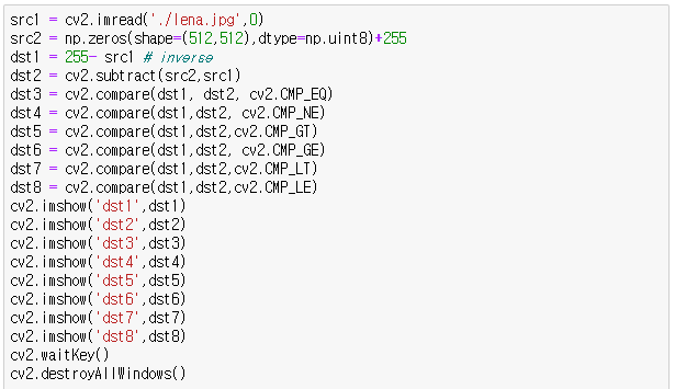 - cv2.THRESH_BINARY_INV: threshold보다 크면 0이고 아니면 value로 바꾸어 줍니다.