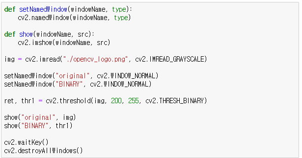 - cv2.THRESH_BINARY: threshold보다 크면 value이고 아니면 0으로 바꾸어 줍니다.