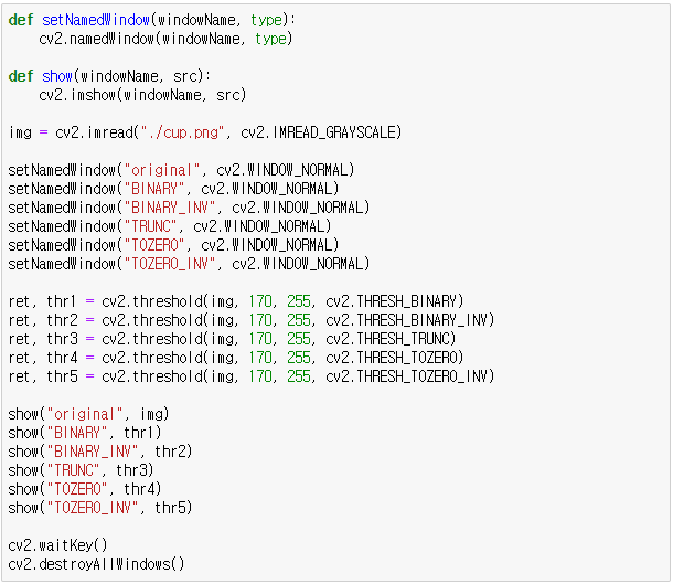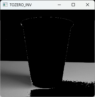- cv2.THRESH_TOZERO_INV: threshold_value보다 크면 0으로 작으면 그대로 할당해준다.
