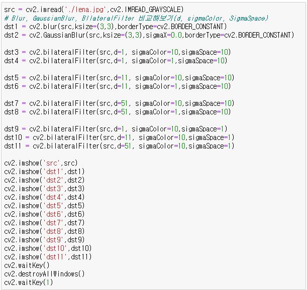 블러, 가우시안, 바이레이터럴, 미디언 모두 비교해보기