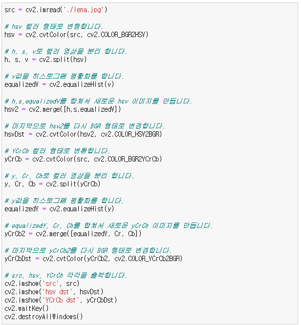 컬러 영상에 히스토그램 평활화 적용해보기(힌트 HSV에서 V가 밝기값, YCrCb에서 y가 밝기값)