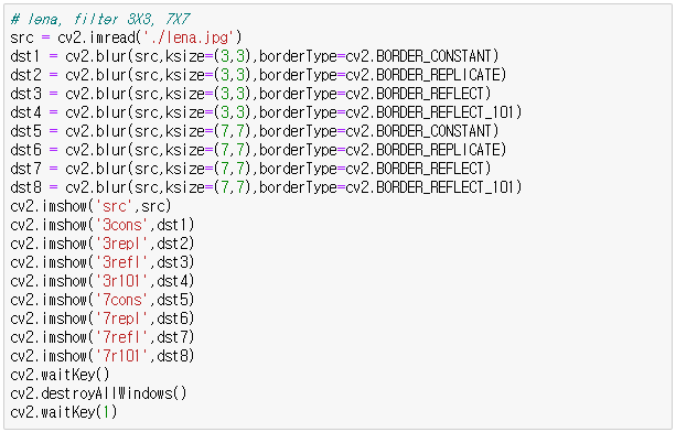 4) cv2.BORDER_REFLECT_101: cv2.BORDER_REFLECT와 같지만 미세한 차이가 있다