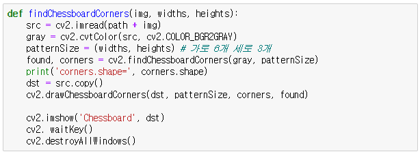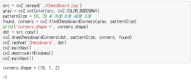 - 카메라 캘리브레이션에 자주 사용되는 체스보드 패턴 검출