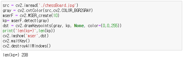 - 그레이스케일 영상 혹은 컬러 영상에서 주변에 비해 밝거나 어두운 영역 중 임계값을 변화시키며 변화율이 작은 영역 검출