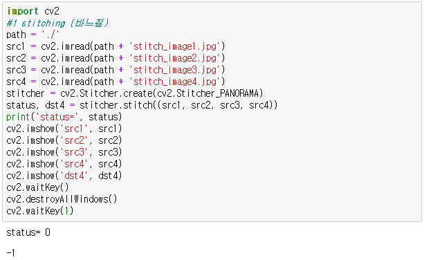 - 여러 장의 영상을 서로 이어붙여 하나의 큰 영상으로 만드는 기법