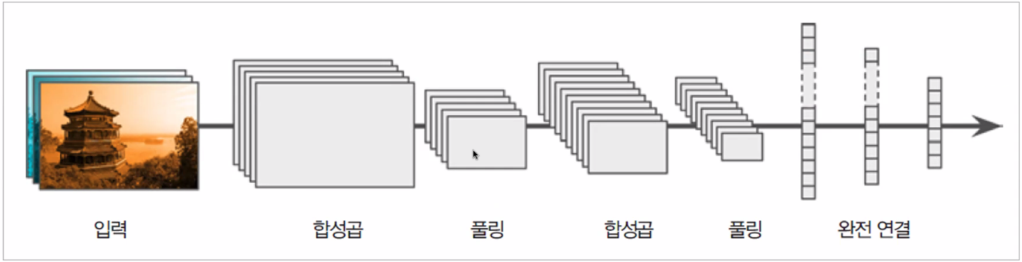 - 합성곱 층을 몇 개 쌓고 (각각 ReLU층을 그 뒤에 놓고), 그 다음 풀링 층을 쌓고, 또 합성곱 층(+ReLU)을 몇 개 더 쌓고, 그 다음 다시 풀링 층을 쌓는 방식