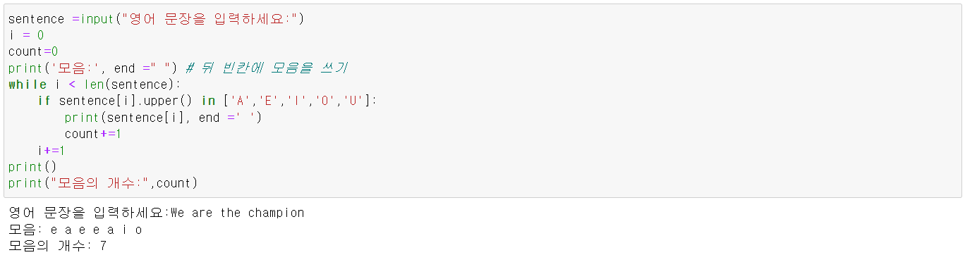 - while문 사용 영어 모음만 출력하고 모음의 개수 구하기