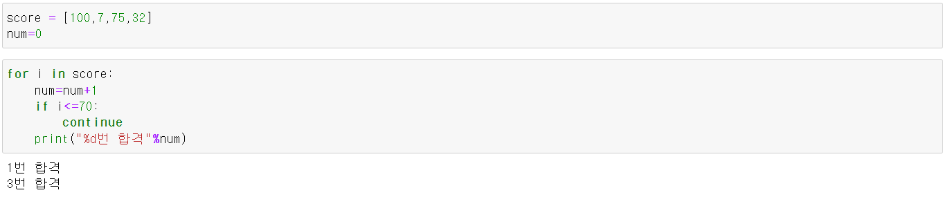 - continue: 조건문 아래의 문장을 실행 안하고 다시 조건문으로 돌아갈 때 사용