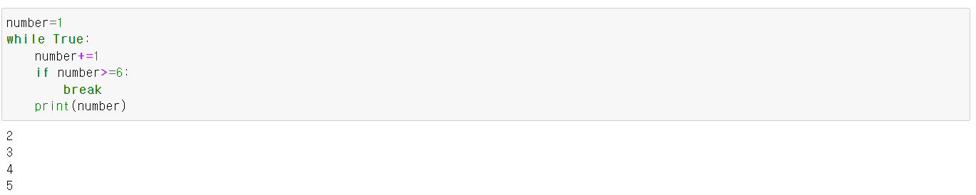 - 변수 number의 초기값이 1이고 반복될 때마다 1씩 증가되게 실행문을 작성한 후 6 이상이 되면 자동으로 멈추는 프로그램 작성