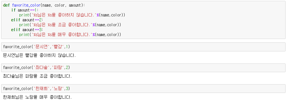 - name, color, amount 파라미터 사용 아래의 실행결과가 나오는 함수 작성