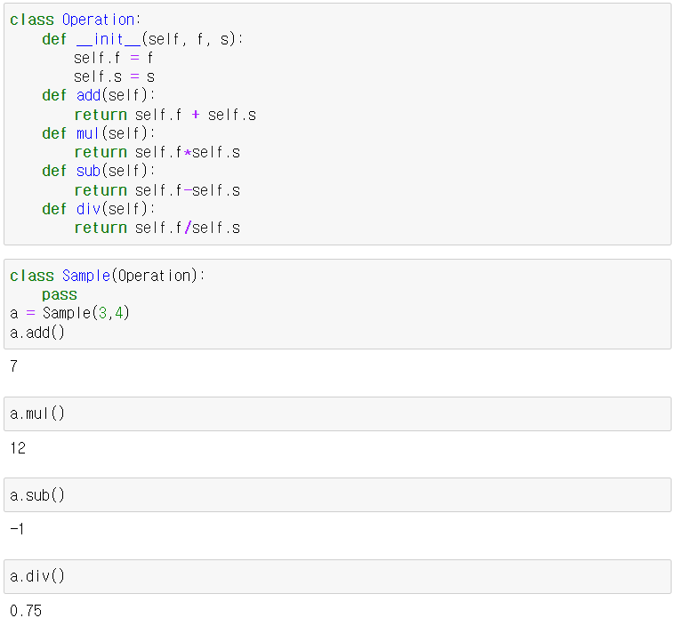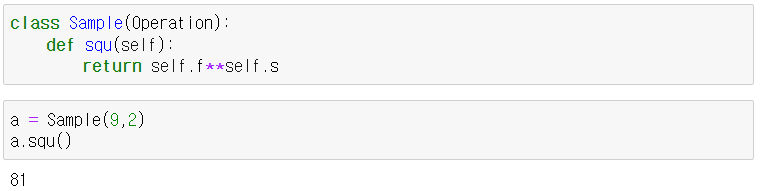 - Sample 클래스에 Operation 클래스를 상속받고 a,b 두 개의 데이터를 넣었을 때 a의 b 승을 계산해주는 메소드를 추가