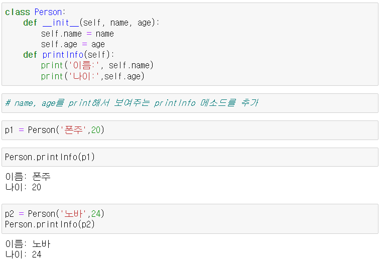 - name, age를 print해서 보여주는 printInfo 메소드 추가