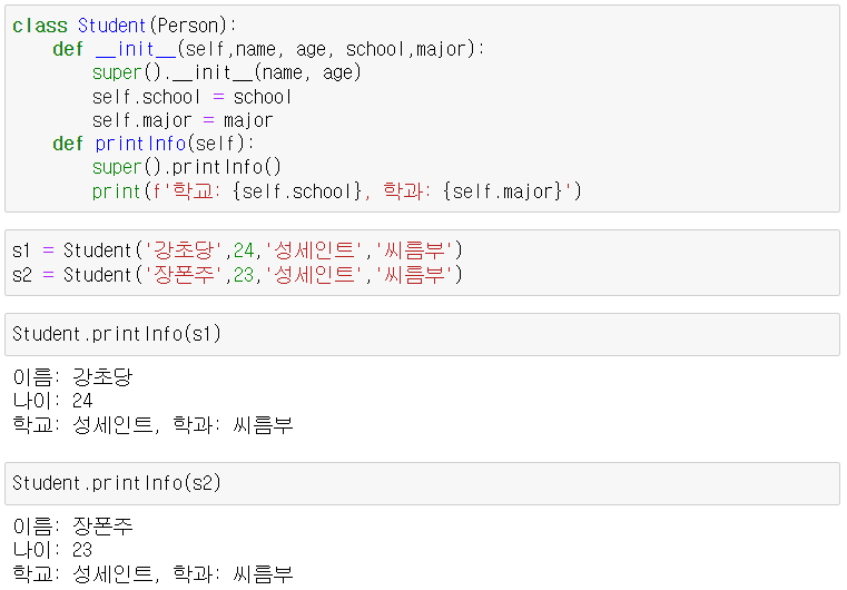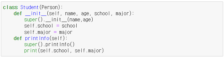- (super 미사용) Student 클래스에 Person 클래스를 상속받으며 School, major 인스턴스 속성을 추가하고, printInfo 메소드에 school, major를 추가