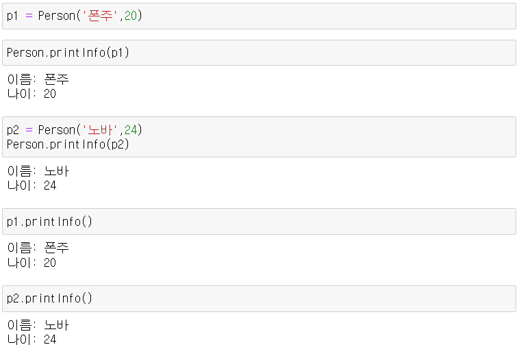 - 초기값으로 name, age를 인스턴스 속성을 가진 Person 클래스를 생성 후 확인