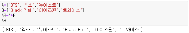 - A와 B 리스트가 있을 때 A와 B의 원소를 모두 갖고 있는 AB 리스트를 만듭니다.