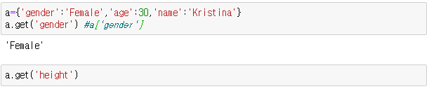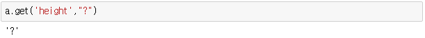 특정 값을 출력. 하지만 딕셔너리 속에 없는 값을 출력하려면 아무것도 안뜬다.딕셔너리 안에 없는 값이지만 뭐라도 출력하기 위해서는 ," "를 사용.