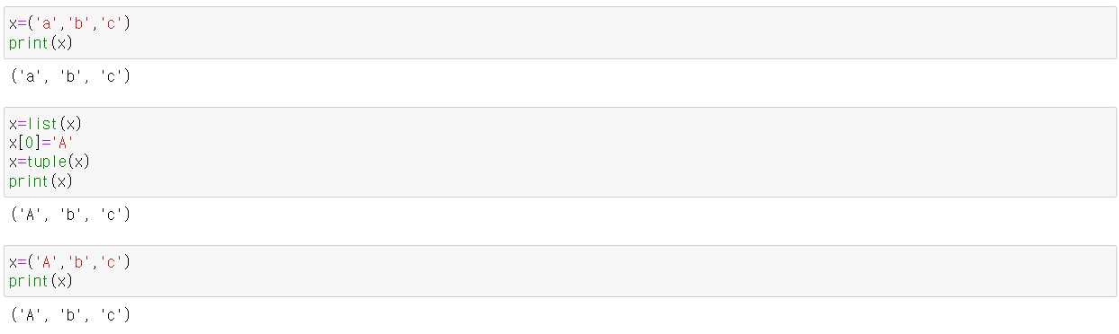 튜플은 수정할 수 없으므로 리스트로 바꿔서 고치거나 새로 만들어야 한다.