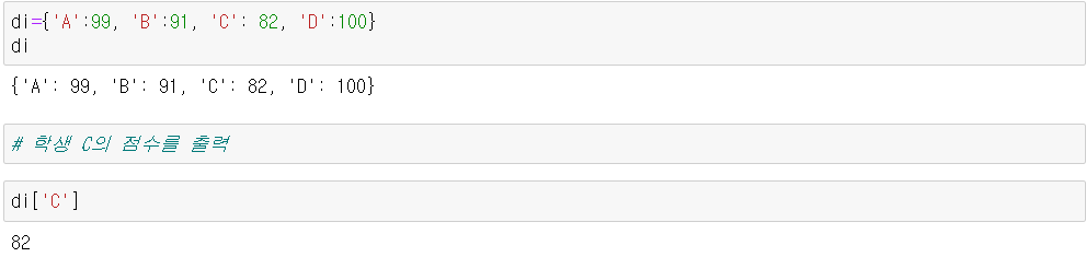 학생 A의 성적은 99, B는 91, C는 82, D는 100점일 때 성적을 딕셔너리로 저장